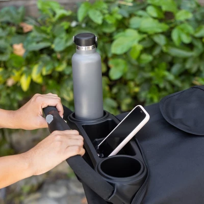 - Covered parent tray with 2-cup holders.