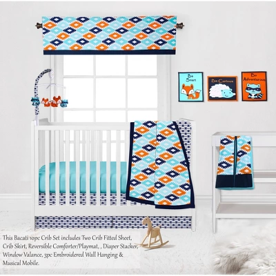 - This Bacati 10-piece Crib Set Includes Reversible Comforter/Playmat (33 x 43 inches), Two Crib fitted sheets (52 x 28 x 6 inches), Crib Skirt/Dust ruffle (13 inch drop) Diaper Stacker (holds more than 30 newborn diapers), Window Valance (15 h x 56 w inches with 1.75 inch Rod Pocket), 3 pc Wall Hangings Set and Musical Mobile in fun, colorful and signature prints in 100 percent cotton 200 Thread Count percale fabrics. Designed in United States by Experienced Designers. Many coordinating items available to purchase separately in this Bacati Aztec Print Liam Aqua Orange Navy Bedding Collection.