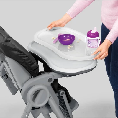 For meals away from the table, a large tray snaps easily onto the armrests, then slides neatly onto the rear legs for storage. A removable tray liner and soft wipeable seat pad offer easy-clean convenience, and rubberized rear locking swivels navigate from room to room without marking floors. The Polly2Start also folds compactly for storage between meals.