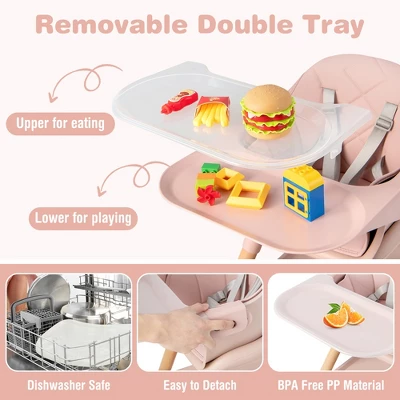 This convertible baby high chair has 6 different functions: high chair, baby high chair, junior stool, toddler dining chair, small chair and small stool. This high chair can meet various needs from infants to toddlers. The tray and seat cushion are removable according to your needs. And the tray has 2 layers for different usages. Made of premium PP material, the tray is dishwasher safe. Also, the PU seat cushion features a smooth, waterproof and easy-to-clean surface. Safety always comes first. This infant feeding chair is built with 5-point safety harness and anti-falling barrier.