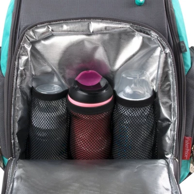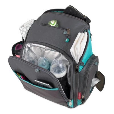 It’s great to be going places with baby, and this super-smart backpack makes it easy, fuss-free and fun. Fashioned of easy care fabric in gray or black, it features the Fastfinder Pocket System for maximum organization and a Super Cooler, so meals-on-the- go are a cinch. Ten pockets give you endless options for storage, including wipes pocket, paci pocket, diaper pocket, phone pocket, and a large insulated front compartment to hold 3 bottles/sippy cups. Changing pad and wipes case are included. For comfort’s sake, you’ll enjoy padded, adjustable shoulder straps, padded mesh back and a reinforced footed bottom.