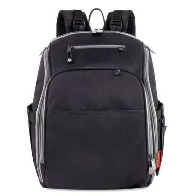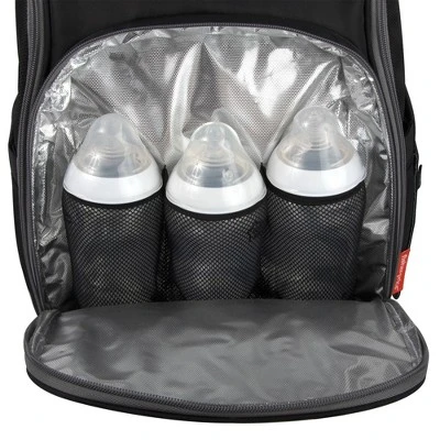 It’s great to be going places with baby, and this super-smart backpack makes it easy, fuss-free and fun. Fashioned of easy care fabric it features the Fastfinder Pocket System for maximum organization and a Super Cooler, so meals-on-the- go are a cinch. 12 pockets give you endless options for storage, including wipes pocket, paci pocket, diaper pocket, phone pocket, and a large insulated front compartment to hold 3 bottles/sippy cups. Changing pad included. For comfort’s sake, you’ll enjoy padded, adjustable shoulder straps, padded mesh back and a reinforced footed bottom.
