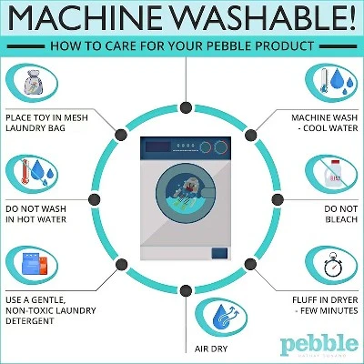 - Machine Washable: For best results, place your Pebble toy in mesh bag and launder with cool water and non-toxic detergent. Fluff in dryer for a few minutes and then air dry.