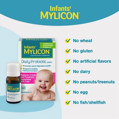 Featuring one of the most researched bacteria strains in the world, Infants’ Mylicon Daily Probiotic Drops have been clinically shown to reduce the crying and fussiness associated with colic when used on a daily basis.*The beneficial bacteria in Infants’ Mylicon Daily Probiotic Drops help balance the healthy bacteria in a baby’s gut to promote good digestive health, as well as help keep a baby healthy by supporting the immune system.*Infants’ Mylicon Daily Probiotic Drops also replenish beneficial bacteria, which may be depleted through the use of antibiotics, to help restore the balance of microflora in thebaby’s digestive system.*