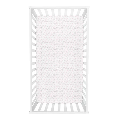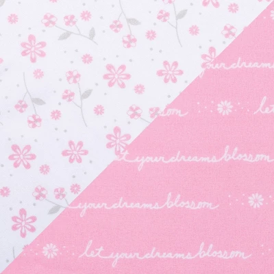 The Floral 2-Pack Microfiber Fitted Crib Sheet Set by Sammy and Lou features a floral print in light pink and gray on a white background and a “let your dreams blossom” script print in white on a light pink background. The adorable pattern brings a delicate and feminine touch to any nursery. Crib sheets fit a standard 28 in x 52 in crib mattress with 8-inch deep pockets and elastic surrounding the entire opening ensuring a more secure fit. Additional coordinating Sammy and Lou Crib Bedding Separates sold separately.Please adhere to JPMA’s Safe Infant Bedding Practices.