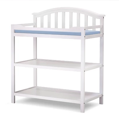 Create a warm and serene space for your child with the Berkley Changing Table from Sorelle. Beautifully designed with classic touches and quality construction, this table is a comfortable spot for changing baby and storing the essentials. Changing table with pad, belt and 2 open shelves. Classic style with gently curved back. Features sturdy construction in a durable finish. Includes anti-tip kit to keep your litte ones safe. 1 year limited manufacturer’s warranty.