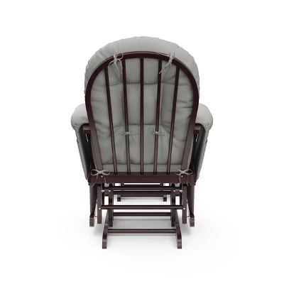 The Storkcraft Hoop Glider and Ottoman offers you generous seating room, comfortable padded arm cushions with storage pockets, and enclosed ball bearings for a smooth gliding motion to gently rock you and your little one to relaxation. Each padded arm cushion includes a convenient storage pocket to hold any reading materials or essentials you need to keep within arm’s reach. The cushions are made of an easy to clean material. Designed to match any nursery, this glider is available in multiple cushion and base colors, so it will match your style and blend seamlessly with the rest of your nursery furniture. Maximum recommended weight (250 pounds); Length (29 inches); Height (40 inches); Width (27.5 inches); Seat width (18 inches); Seat depth (18 inches); Seat height (17.5 inches); Ottoman length (16 inches); Ottoman height (14.5 inches); Ottoman width (20 inches). This product requires assembly. Base of glider made of solid hardwood material.
