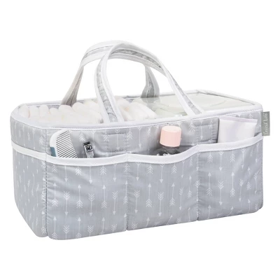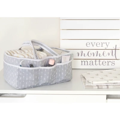 Add organization to any area of your home with the portable Gray Arrows Storage Caddy by Trend Lab. Perfect for dressers and changing stations, this lightly padded caddy has 8 outer pockets and a removable “T” separator for maximum versatility. The body, handles, and lining feature scattered arrows in white on a gray background with white trim. Keep diapers, wipes, and other necessities tidy while traveling from room to room. Caddy also functions as an organizer for crafts, picnics, pet supplies, etc. Measures 12.5 in x 6 in x 8 in.